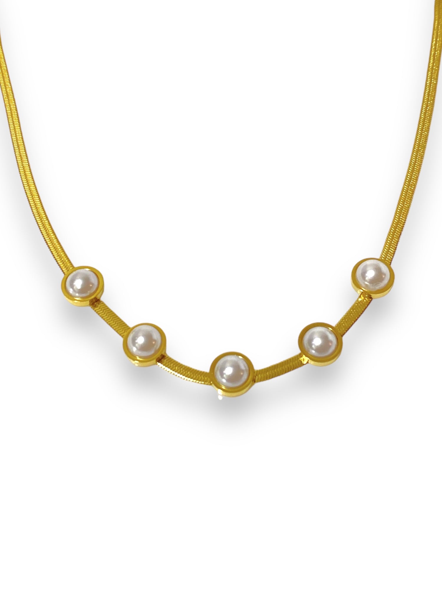 Collar bañado en oro amarillo con perlas sintéticas, elegante y sofisticado. Perfecto para ocasiones especiales o para el uso diario. Su diseño atemporal realza cualquier atuendo, añadiendo un toque de lujo y distinción. Ideal como regalo o para consentirte.